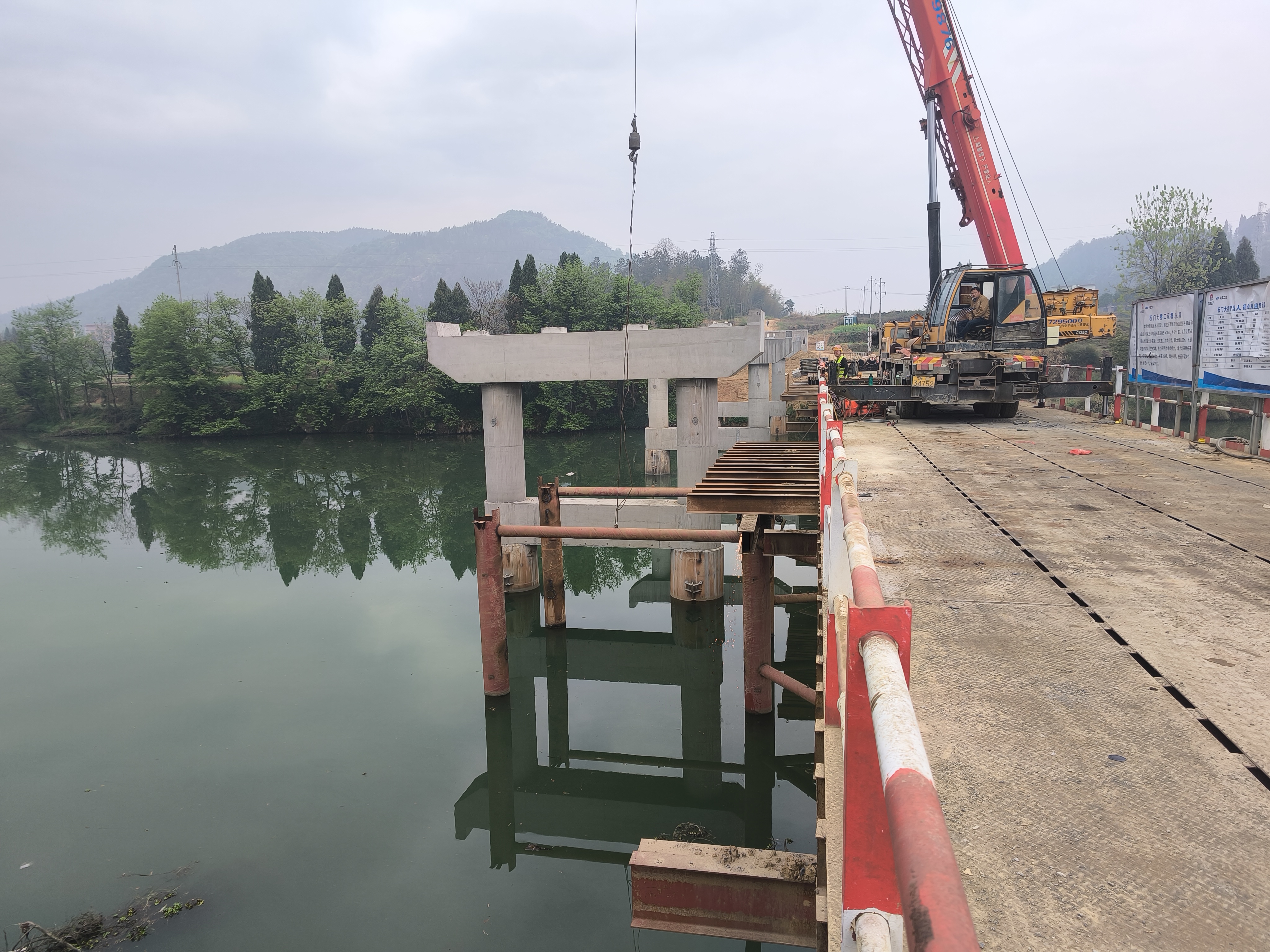 石門大橋是G59新新高速項(xiàng)目的關(guān)鍵控制性工程之一。其樁基施工于2024年7月19日正式啟動,至2025年1月15日全部完成,共澆筑樁基12根。其中,6根樁基位于辰水河中央,施工難度較大。為確保工程順利推進(jìn),項(xiàng)目部在河面上搭設(shè)了一座長120米、寬9米的鋼棧橋,為水中樁基施工提供了重要保障。