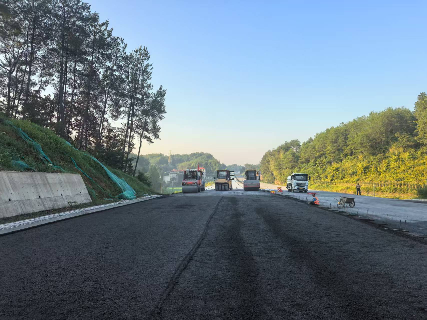 施工過程中,項(xiàng)目面臨多重挑戰(zhàn):一是水穩(wěn)料運(yùn)距較遠(yuǎn),且前期施工便道坡度大,運(yùn)輸難度顯著;二是受南方雨季影響,多雨天氣對施工進(jìn)度與質(zhì)量控制提出更高要求。為攻克難題、確保施工質(zhì)量,項(xiàng)目部針對性制定解決方案:針對水穩(wěn)邊部成型與密實(shí)度問題,采用鋼模板雙支撐工藝,同步推行“邊攤鋪邊注水泥漿”作業(yè)模式,有效提升邊部施工質(zhì)量;為強(qiáng)化水穩(wěn)層間連接效果,在攤鋪下一層前,在上一層表面均勻?yàn)⒉妓酀{,保障層間結(jié)合緊密。