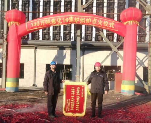 “央企使命 攻堅(jiān)克難保履約 二冶精神 淬火成鋼鑄精品”, 11月14日,在中國二冶集團(tuán)山東區(qū)域分公司承建的建龍西鋼140萬噸/年焦化項(xiàng)目1#焦?fàn)t點(diǎn)火烘爐儀式現(xiàn)場,業(yè)主單位建龍西鋼鋼鐵有限公司焦化廠廠長安豐森向中國二冶集團(tuán)贈(zèng)送錦旗,山東區(qū)域分公司總經(jīng)理郝寶成親手接過錦旗。