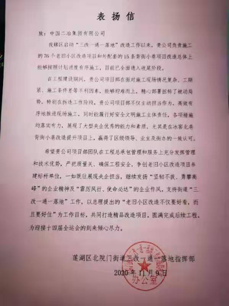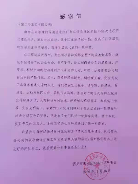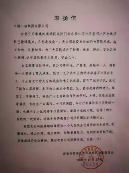近日,由中國二冶集團承建的蓮湖區(qū)老舊小區(qū)改造工程連續(xù)收到蓮湖區(qū)北院門街道三改一通一落地指揮部、西安市蓮湖區(qū)雙仁府社區(qū)、西安市蓮湖區(qū)迎春社區(qū)多封感謝信及西安市蓮湖區(qū)迎春社區(qū)、大學習巷勞動局家屬院錦旗,這些感謝信和錦旗中體現(xiàn)了老舊小區(qū)改造之后當?shù)卣兔癖妼χ袊钡母兄x。