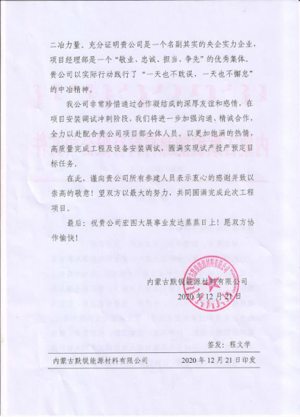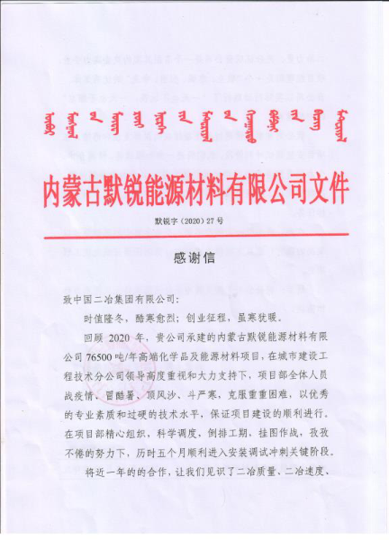感謝信中指出:回顧2020年,貴公司承建的內(nèi)蒙古默銳能源材料有限公司76500噸電/年高端化學(xué)品及能源材料項目,在中國二冶集團及城市建設(shè)工程技術(shù)公司領(lǐng)導(dǎo)高度重視和大力支持下,項目部全體人員戰(zhàn)疫情、冒酷暑、頂風(fēng)沙、斗嚴(yán)寒,克服重重困難,以優(yōu)秀的專業(yè)素質(zhì)和過硬的技術(shù)水平,保證項目建設(shè)的順利進行。在項目部精心組織、科學(xué)調(diào)度、倒排工期、掛圖作戰(zhàn),孜孜不倦的努力下,歷時五個月順利進入安裝調(diào)試沖刺關(guān)鍵階段。將近一年的合作,讓我們見識了二冶質(zhì)量、二冶速度、二冶力量,充分證明貴公司是一個名副其實的央企實力企業(yè)。項目經(jīng)理部是一個“敬業(yè)、忠誠、擔(dān)當(dāng)、爭先”的優(yōu)秀集體。我公司非常珍惜通過合作凝結(jié)成的深厚友誼和感情,在項目安裝調(diào)試沖刺關(guān)鍵階段,我們將進一步加強溝通、精誠合作,全力以赴配合貴公司項目部全體人員,以更加飽滿的熱情,高質(zhì)量完成工程及設(shè)備安裝調(diào)試,圓滿實現(xiàn)試產(chǎn)投產(chǎn)預(yù)定目標(biāo)任務(wù),并向中國二冶所有參建人員表示衷心的感謝和崇高敬意!