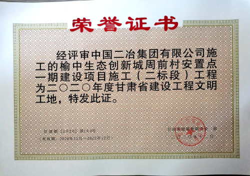 1月12日,甘肅省建筑業(yè)聯(lián)合會(huì)對(duì)外發(fā)布《關(guān)于公布2020年度甘肅省建設(shè)工程文明工地評(píng)選結(jié)果的通知》,中國(guó)二冶甘肅分公司榆中生態(tài)創(chuàng)新城周前村安置點(diǎn)一期建設(shè)項(xiàng)目施工(二標(biāo)段)工程榮獲甘肅省建設(shè)工程文明工地稱號(hào)。