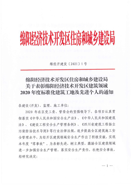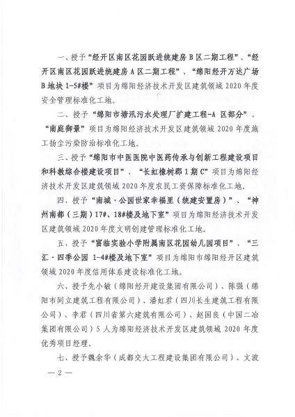 1月18日,從綿陽經(jīng)濟(jì)技術(shù)開發(fā)區(qū)住房和城鄉(xiāng)建設(shè)局獲悉,中國二冶經(jīng)開區(qū)南區(qū)花園躍進(jìn)統(tǒng)建房A、B區(qū)項目分別榮獲“綿陽經(jīng)濟(jì)技術(shù)開發(fā)區(qū)建筑領(lǐng)域2020年度安全管理標(biāo)準(zhǔn)化工地”稱號,同時,項目經(jīng)理趙國良被授予“綿陽經(jīng)濟(jì)技術(shù)開發(fā)區(qū)建筑領(lǐng)域2020年度優(yōu)秀項目經(jīng)理”。