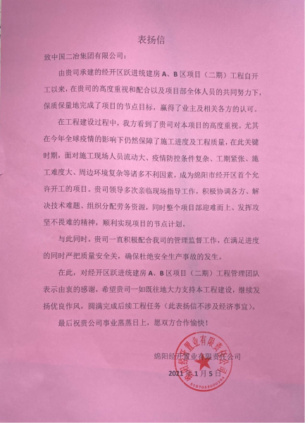 1月18日,業(yè)主單位綿陽經開置業(yè)有限責任公司發(fā)來表揚信,對中國二冶承建的經開區(qū)南區(qū)花園躍進統建房A、B區(qū)項目(二期)工程如期完成主體結構全部封頂,保證了后續(xù)施工的順利開展表示衷心的感謝。