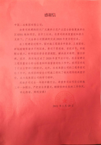 1月22日,四川分公司廣元康養(yǎng)示范產業(yè)園項目部收到廣元金泰半山房地產開發(fā)有限公司發(fā)來的感謝信,對中國二冶精心組織施工和項目部全體員工的辛勤付出表示由衷感謝和崇高敬意。