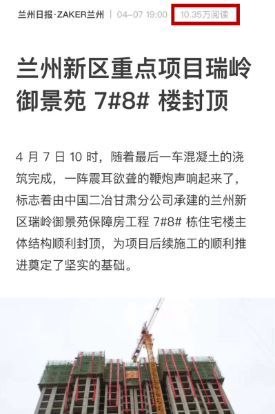 4月7日,人民網(wǎng)、新華網(wǎng)、中國財(cái)經(jīng)網(wǎng)、鳳凰網(wǎng)、中華網(wǎng)、中國施工企業(yè)管理協(xié)會(huì)、正北方網(wǎng)、蘭州日?qǐng)?bào)及蘭州日?qǐng)?bào)新媒體平臺(tái)等10余家主流媒體報(bào)道中國二冶甘肅分公司承建的蘭州新區(qū)瑞嶺御景苑保障房工程7#8#棟住宅樓主體結(jié)構(gòu)順利封頂。其中,蘭州日?qǐng)?bào)新媒體平臺(tái)ZAKER蘭州刊發(fā)的消息,閱讀量達(dá)到8.11萬。