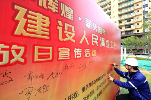 在辦實(shí)事、開新局環(huán)節(jié),項(xiàng)目全體黨員在黨旗下重溫入黨誓詞,表示要踐行長(zhǎng)征精神,建設(shè)人民滿意工程,更加堅(jiān)定作為一名共產(chǎn)黨員的理想信念;活動(dòng)中,中國(guó)二冶黨群工作部向黨員突擊隊(duì)和青年突擊隊(duì)授旗,各方代表表達(dá)了“踐行初心使命,認(rèn)真履職盡責(zé)”的決心;全體職工簽下請(qǐng)戰(zhàn)書,紛紛表示將繼續(xù)充分發(fā)揚(yáng)“一天也不耽誤,一天也不懈怠”的中冶精神,以求真務(wù)實(shí)、開拓創(chuàng)新的精神,把全部力量凝聚到項(xiàng)目建設(shè)中來(lái),向成都市人民交出一份滿意的答卷,隨后,各方代表圍繞安全環(huán)保、項(xiàng)目建設(shè)、工程質(zhì)量、工程進(jìn)度等情況進(jìn)行充分探討,對(duì)中國(guó)二冶董家埂社區(qū)工程的建設(shè)亮點(diǎn)進(jìn)行深入了解。