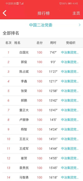 本次黨史知識競賽,內(nèi)容涵蓋了習(xí)近平《論中國共產(chǎn)黨歷史》、《毛澤東、鄧小平、江澤民、胡錦濤關(guān)于中國共產(chǎn)黨歷史論述摘編》、《習(xí)近平新時(shí)代中國特色社會主義思想學(xué)習(xí)問答》、《中國共產(chǎn)黨簡史》等黨史內(nèi)容。競賽依托五礦智慧黨建app平臺進(jìn)行,競賽共300道試題,包括單項(xiàng)選擇、多項(xiàng)選擇。在競賽時(shí)間內(nèi)可以隨時(shí)參與答題。后臺會根據(jù)答題的正確率由高到低進(jìn)行排列,正確率相同的,將已答題用時(shí)進(jìn)行排序。在答題競賽中,每位黨員積極思考,認(rèn)真答題,踴躍參與,不少黨員紛紛表示,通過這個(gè)知識競賽,使黨史、黨章、黨規(guī)都印在腦海里,理解也深刻。希望公司今后能多舉辦類似活動,提升黨員政治理論知識與黨員思想覺悟能力,爭做優(yōu)秀共產(chǎn)黨員。本次黨史知識競賽活動,公司共有1560名黨員干部踴躍參加,經(jīng)過激烈角逐,來自四川分公司的白國光以7分47秒的優(yōu)異成績?nèi)〉脻M分,獲得本次競賽活動的一等獎;來自市政分公司的郭俊等5名黨員獲得二等獎;來自華東分公司的王成軍等10名黨員獲得三等獎;來自甘肅分公司的高國義等30名黨員獲得優(yōu)秀獎。