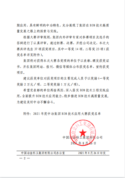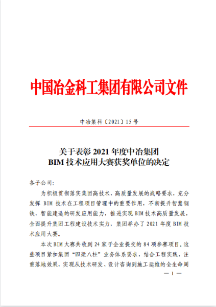 8月26日,中冶集團〔2021〕5號文件《關于表彰2021年度中冶集團BIM技術應用大賽獲獎單位的決定》揭曉獲獎名單,中國二冶包頭市實訓基地項目《包頭高技能人才公共實訓基地項目BIM技術應用》在本次大賽中榮獲“2021年度中冶集團BIM技術應用大賽二等獎”。