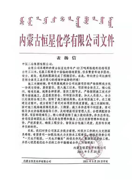 9月29日,內(nèi)蒙古恒星化學(xué)有限公司發(fā)來表揚(yáng)信,對中國二冶及達(dá)旗項(xiàng)目部精心組織、精準(zhǔn)實(shí)施表示由衷感謝,對統(tǒng)籌各種資源、落實(shí)工期節(jié)點(diǎn)、嚴(yán)格按照施工技術(shù)步驟與措施施工給予高度贊揚(yáng)。