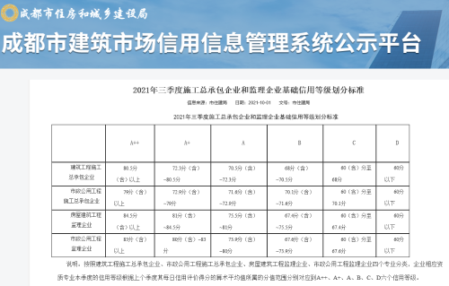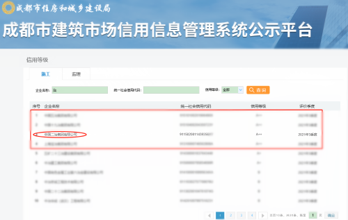 10月8日,成都市建筑市場信用信息管理系統(tǒng)公示平臺數(shù)據(jù)顯示,中國二冶在成都地區(qū)信用等級二、三季度蟬聯(lián)A++。進一步樹立起了中國二冶在蜀良好的誠信品牌形象。