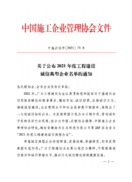 工程建設(shè)誠信典型企業(yè)由中國施工企業(yè)管理協(xié)會信用評價工作委員會組織實施,評估周期為一年。其目的旨在倡導(dǎo)企業(yè)誠信經(jīng)營并對工程建設(shè)行業(yè)運營規(guī)范、信譽良好、社會責任感強的誠信企業(yè)給予激勵與褒獎,發(fā)揮好誠信典型示范引領(lǐng)作用。
