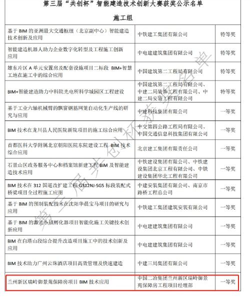 11月30日,由中國技術(shù)創(chuàng)業(yè)協(xié)會(huì)技術(shù)創(chuàng)新委員會(huì)主辦的第三屆“共創(chuàng)杯”智能建造技術(shù)創(chuàng)新大賽比賽結(jié)果揭曉,中國二冶集團(tuán)“蘭州新區(qū)瑞嶺御景苑項(xiàng)目的BIM技術(shù)應(yīng)用”榮獲施工組一等獎(jiǎng),“基于BIM技術(shù)在張家川回族自治縣中醫(yī)醫(yī)院醫(yī)技綜合樓及二期建設(shè)項(xiàng)目的施工應(yīng)用”作品榮獲施工組二等獎(jiǎng)。