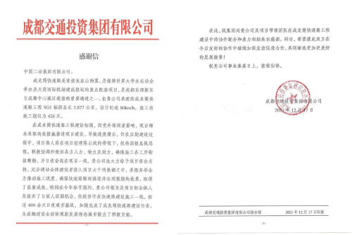 12月17日,成都交通投資集團(tuán)有限公司致中國二冶表揚(yáng)信,對中國二冶四川分公司在成龍簡快速路工程項(xiàng)目施工建設(shè)中,攻堅(jiān)克難、頑強(qiáng)奮戰(zhàn),優(yōu)質(zhì)、安全、高效地完成施工建設(shè)任務(wù),順利實(shí)現(xiàn)快速路主體工程全線貫通給予表揚(yáng)。