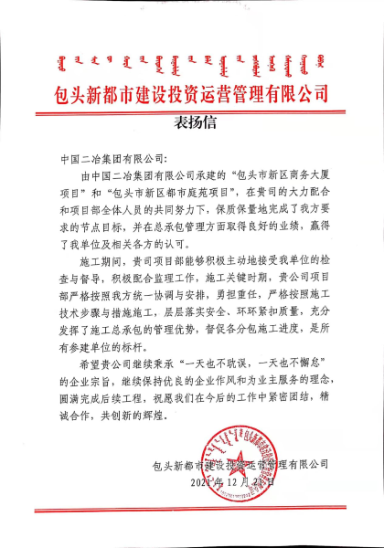 12月21日,包頭新都市建設(shè)投資運營管理有限公司致中國二冶表揚信。衷心感謝中國二冶各級領(lǐng)導(dǎo)和全體員工的共同努力,保質(zhì)保量完成包頭市新都市區(qū)商務(wù)大廈、新都市區(qū)都市庭苑項目各項網(wǎng)絡(luò)節(jié)點目標(biāo),取得良好業(yè)績,贏得各方的稱贊和認可。