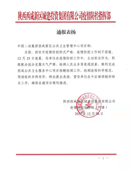 12月26日,西咸新區(qū)城建投資集團(tuán)疫情防控指揮部向中國二冶致表揚(yáng)信。信中盛贊中國二冶集團(tuán)在疫情防控最關(guān)鍵的時(shí)刻,主動(dòng)擔(dān)當(dāng)作為,充分展現(xiàn)央企的擔(dān)當(dāng)與實(shí)力。對(duì)中國二冶西咸新區(qū)公共衛(wèi)生管理中心項(xiàng)目部全體人員在抗疫中所付出的努力和艱辛給予肯定和表揚(yáng)。