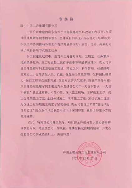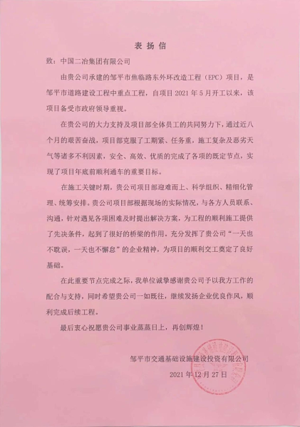 12月27日,山東鄒平市交通基礎(chǔ)設(shè)施建設(shè)投資有限公司、濟(jì)南金諾公路工程監(jiān)理有限公司致中國二冶表揚(yáng)信。信中稱贊中國二冶在施工關(guān)鍵時期科學(xué)組織、統(tǒng)籌安排、迎難而上、精細(xì)化管理,特此向中國二冶集團(tuán)各級領(lǐng)導(dǎo)及全體參戰(zhàn)員工表示由衷的感謝和誠摯的問候。