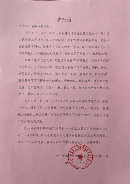 12月29日,沈丘縣城區(qū)改造建設(shè)投資開發(fā)有限公司向中國二冶發(fā)來表揚(yáng)信,對(duì)中國二冶各級(jí)領(lǐng)導(dǎo)給予工程高度重視和大力支持表示衷心感謝,對(duì)該項(xiàng)目自開工建設(shè)以來,項(xiàng)目部全體人員所付出的努力和艱辛給予肯定和表揚(yáng)。