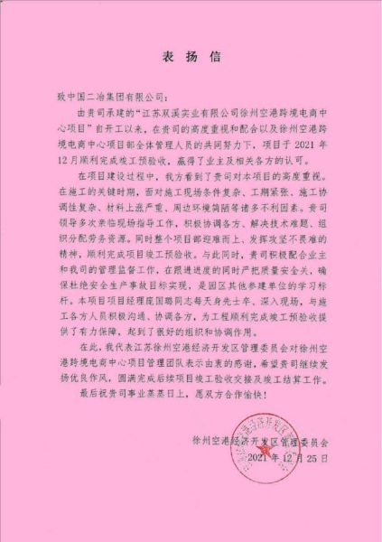 12月30日,中國二冶收到徐州空港經濟開發(fā)區(qū)管委會表揚信,對項目于12月25日順利完成竣工預驗收給予表揚,對中國二冶徐州空港跨境電商中心項目管理團隊表示由衷的感謝。信中寫到,在項目建設過程中,我方看到了貴司對本項目的高度重視. 在施工的關鍵時期,面對施工現場條件復雜、工期緊張、施工協調性復雜、材料上漲嚴重、周邊環(huán)境簡陋等諸多不利因素,貴司領導多次親臨現場指導工作,積極協調各方、解決技術難題。同時整個項目團隊迎難而上、發(fā)揮攻堅不畏難的精神,順利完成項目竣工預驗收,是園區(qū)其他參建單位的學習標桿。