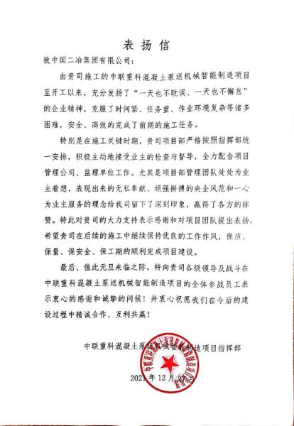 12月27日,中聯重科混凝土泵送機械智能制造項目指揮部向中國二冶致表揚信,對中國二冶項目部安全高效的完成項目前期施工任務表示感謝。信中指出,在施工關鍵時期,中國二冶中聯重科項目部嚴格按照指揮部統一安排,積極主動地接受業(yè)主的檢查與督導,全力配合項目管理公司、監(jiān)理單位工作。特別是項目管理團隊處處為業(yè)主著想及吃苦耐勞,頑強拼搏的工作作風給我們留下了深刻印象,贏得了各方的稱贊。希望中國二冶項目團隊在后續(xù)的施工中繼續(xù)保持優(yōu)良的工作作風,保質、保量、保安全、保工期的順利完成項目建設任務。