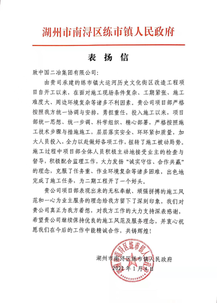 1月4日,湖州市南潯區(qū)練市鎮(zhèn)人民政府致中國二冶表揚信,對中國二冶路橋分公司大運河項目部無私奉獻、頑強拼搏的施工風(fēng)范和一心為業(yè)主服務(wù)的理念表示感謝。