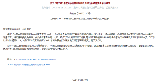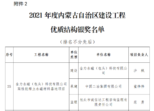 1月19日,由內(nèi)蒙古自治區(qū)建筑業(yè)協(xié)會發(fā)布,經(jīng)過專家組層層審查、評審,中國二冶兩項(xiàng)目喜獲2021年度內(nèi)蒙古自治區(qū)建設(shè)工程優(yōu)質(zhì)結(jié)構(gòu)獎。其中,中國二冶城建分公司包頭市新都市區(qū)都市庭苑商住項(xiàng)目榮獲2021年度內(nèi)蒙古自治區(qū)建設(shè)工程優(yōu)質(zhì)結(jié)構(gòu)金獎,金力永磁(包頭)科技有限公司高性能稀土永磁材料基地項(xiàng)目獲得優(yōu)質(zhì)結(jié)構(gòu)獎(銀獎),為二冶獎牌榜再添殊榮。