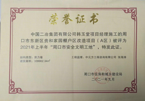 1月23日,中國二冶周口貴和家園項(xiàng)目部收到由周口市住房和城鄉(xiāng)建設(shè)局頒布的“周口市安全文明工地”榮譽(yù)證書。