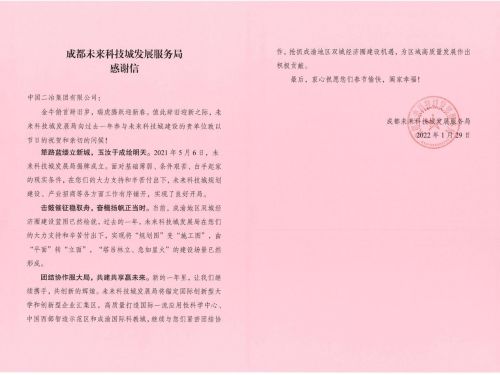 1月29日,成都未來科技城發(fā)展服務(wù)局致中國二冶感謝信,