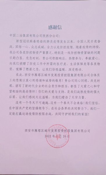 信中指出,隨著西安市疫情的持續(xù),西安市雁塔區(qū)城市發(fā)展投資控股集團有限公司各類防控物資嚴(yán)重匱乏,特別是一線防控物資緊缺的問題日趨凸顯。危急時刻,中國二冶集團陜西分公司向西安市雁塔區(qū)城市發(fā)展投資控股集團有限公司伸出了援助之手,向其捐贈了防疫工作中所需的醫(yī)療類、生活保障類等各類物資,緩解了燃眉之急,讓西安市雁塔區(qū)城市發(fā)展投資控股集團有限公司倍感溫暖、深受感動。