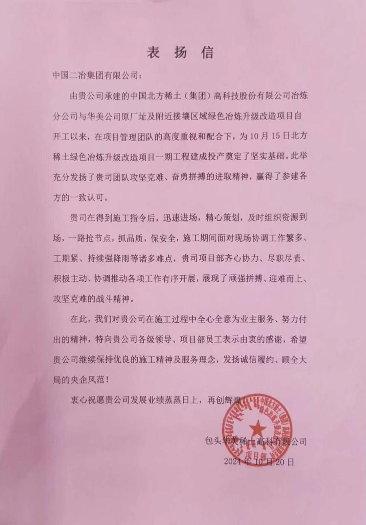 10月23日,中國(guó)二冶收到包頭華美稀土高科有限公司表?yè)P(yáng)信,對(duì)中國(guó)二冶承建的中國(guó)北方稀土(集團(tuán))高科技股份有限公司冶煉分公司與華美公司原廠址及附近接壤區(qū)域綠色冶煉升級(jí)改造項(xiàng)目在施工過(guò)程中秉持敬業(yè)精神、盡心竭力為業(yè)主服務(wù)表示由衷感謝。