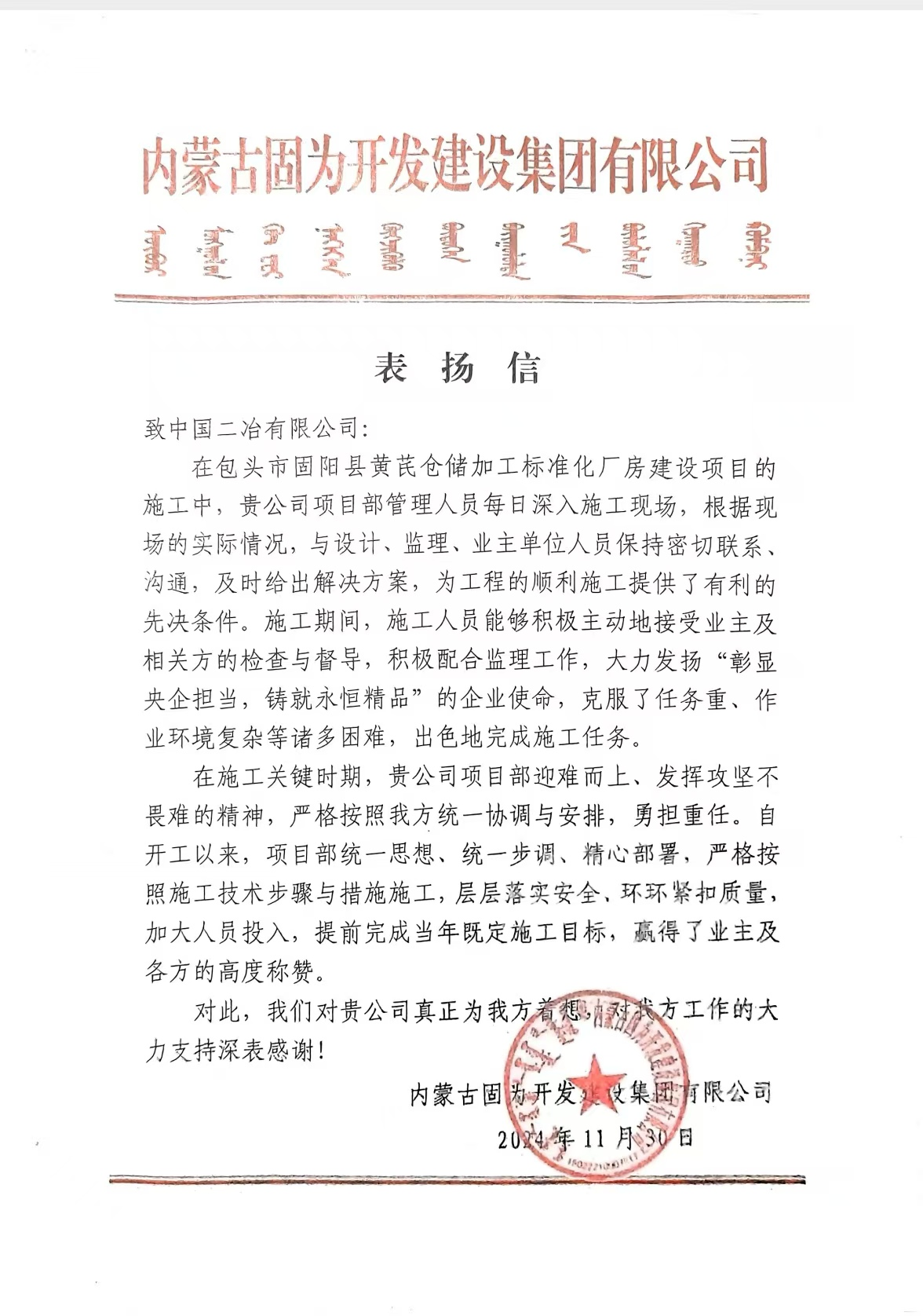 12月2日,中國(guó)二冶收到內(nèi)蒙古固為開發(fā)建設(shè)集團(tuán)有限公司發(fā)來的第二封表?yè)P(yáng)信,高度稱贊項(xiàng)目管理團(tuán)隊(duì)提前完成固陽(yáng)縣黃芪倉(cāng)儲(chǔ)加工標(biāo)準(zhǔn)化廠房建設(shè)項(xiàng)目既定目標(biāo)的杰出表現(xiàn)。
