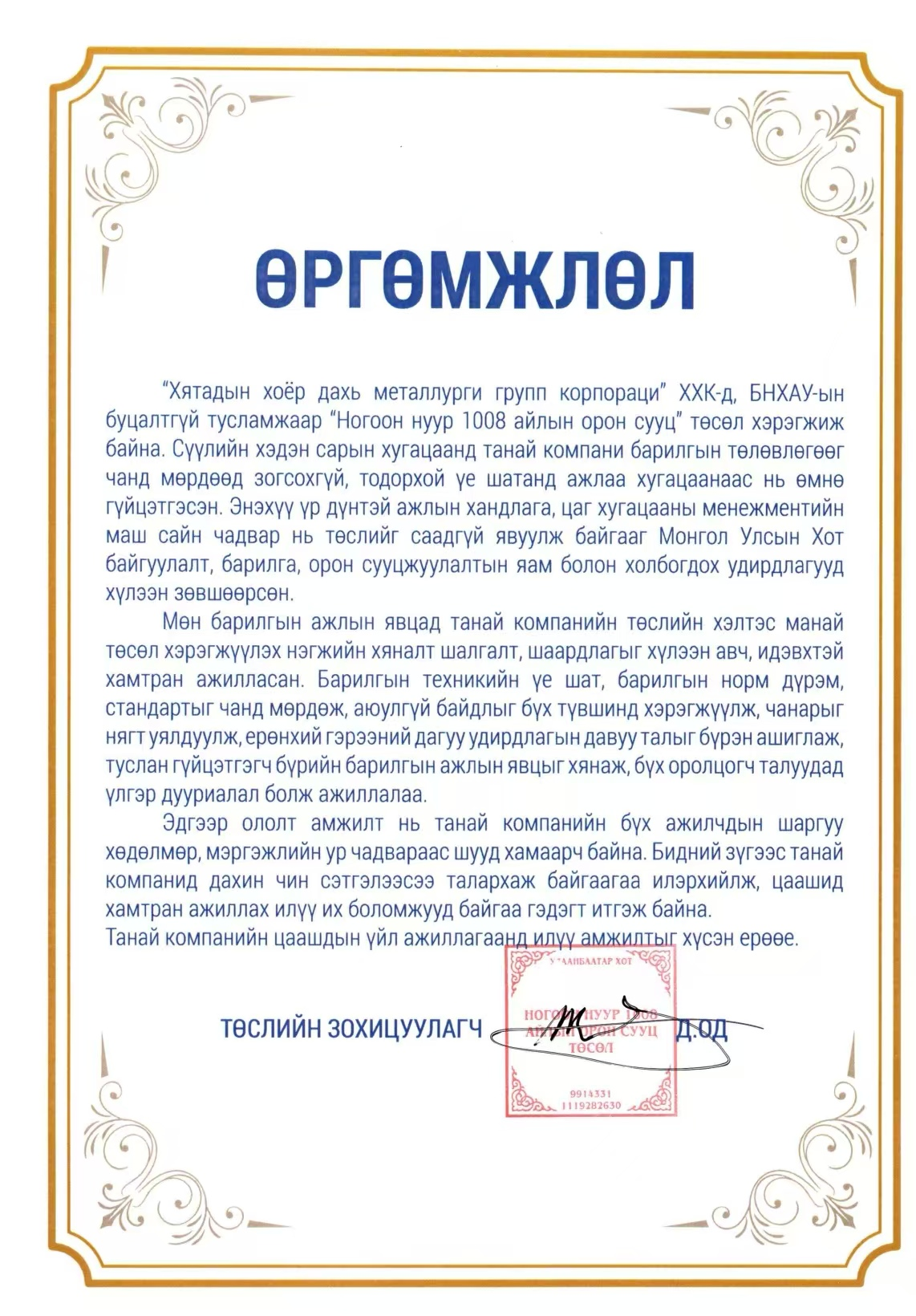 12月21日,中國(guó)二冶收到蒙古國(guó)城建部綠湖1008戶項(xiàng)目辦表?yè)P(yáng)信,對(duì)中國(guó)二冶一直以來(lái)以高效的工作態(tài)度和出色的管理能力、先進(jìn)的施工方法,高效優(yōu)質(zhì)實(shí)現(xiàn)項(xiàng)目網(wǎng)絡(luò)節(jié)點(diǎn)目標(biāo)給予充分肯定和表?yè)P(yáng)。