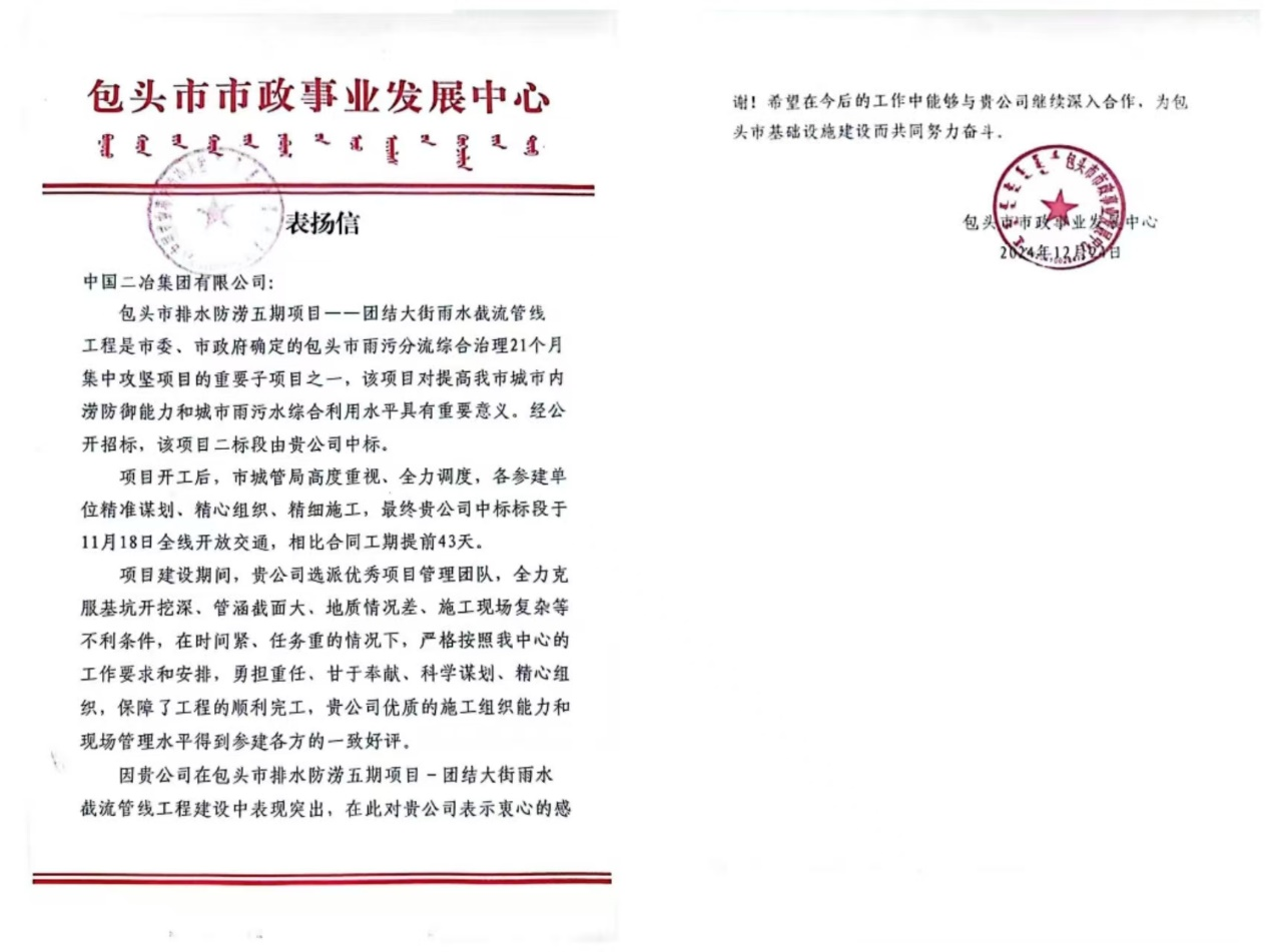 近日,中國二冶收到包頭市市政事業(yè)發(fā)展中心表揚(yáng)信。高度贊揚(yáng)項(xiàng)目管理團(tuán)隊(duì)提前43天實(shí)現(xiàn)團(tuán)結(jié)大街雨水截流管線工程施工二標(biāo)段全線開放交通,順利通車的目標(biāo)。
