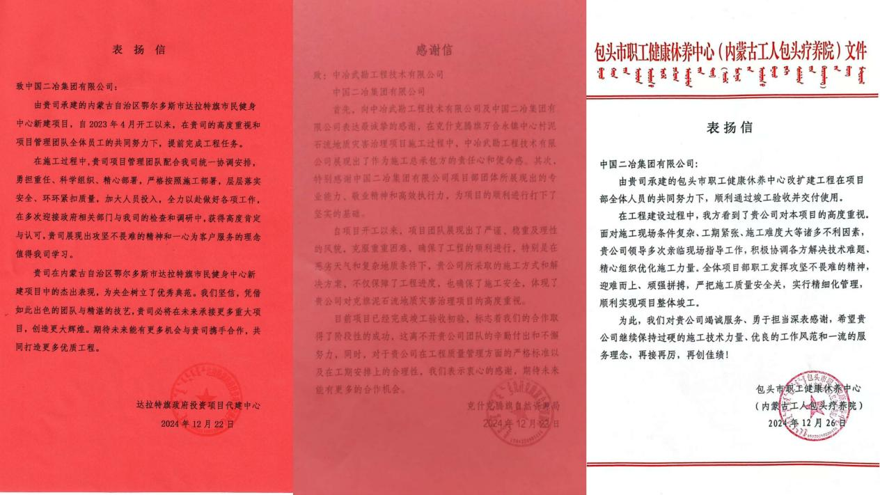 近日,中國二冶先后收到來自達(dá)拉特旗政府投資項目代建中心、克什克騰旗自然資源局以及包頭市職工健康休養(yǎng)中心的三封表揚(yáng)信。信中高度贊揚(yáng)了中國二冶在達(dá)旗健民中心項目、赤峰泥石流項目、包頭康養(yǎng)項目建設(shè)中展現(xiàn)出的卓越專業(yè)能力、嚴(yán)謹(jǐn)施工態(tài)度以及為地方經(jīng)濟(jì)社會發(fā)展作出的積極貢獻(xiàn)。