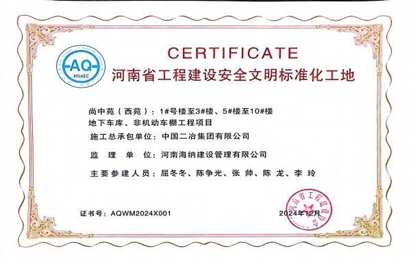 近日,由中國二冶承建的尚中苑(西苑)工程項目榮獲河南省工程建設協會“河南省工程建設安全文明標準化工地”榮譽稱號。
