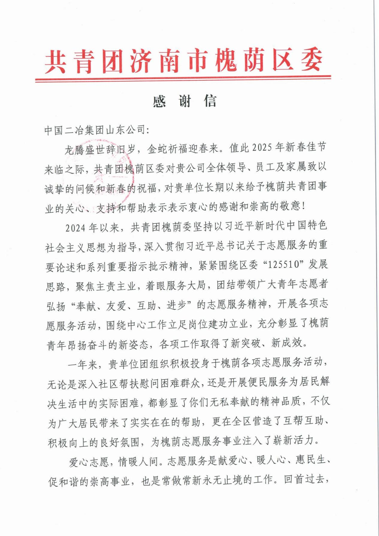 共青團(tuán)濟(jì)南市槐蔭區(qū)委在信中寫道,山東公司團(tuán)委積極投身于槐蔭各項(xiàng)志愿服務(wù)活動,無論是深入社區(qū)幫扶慰問困難群眾,還是開展便民服務(wù)為居民解決生活中的實(shí)際困難,彰顯了無私奉獻(xiàn)的精神品質(zhì),為廣大居民帶來了實(shí)實(shí)在在的幫助,更在槐蔭區(qū)營造了互幫互助、積極向上的良好氛圍,為槐蔭志愿服務(wù)事業(yè)注入了嶄新活力。