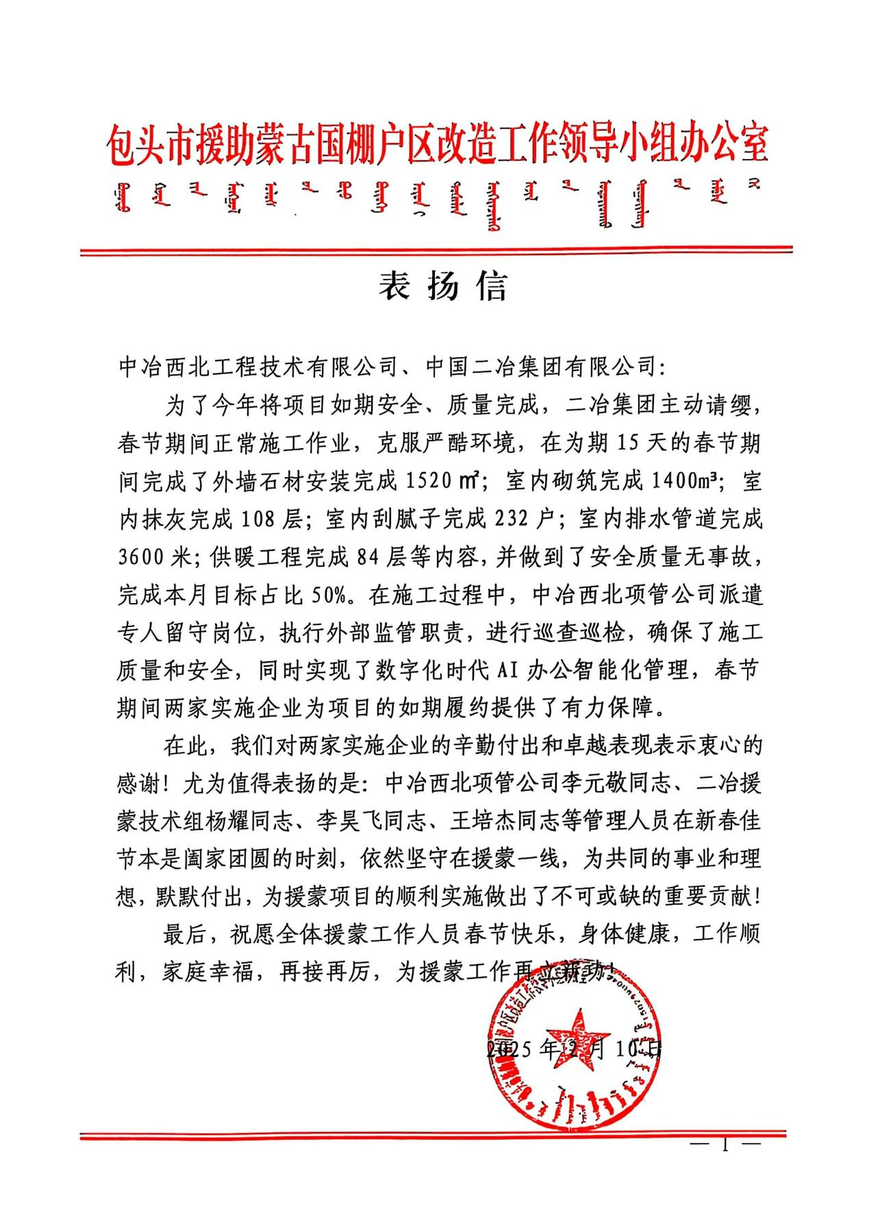 信中強調(diào),新春佳節(jié)本是闔家團圓的美好時刻,但是中國二冶援蒙項目楊耀、李昊飛、王培杰等一大批管理人員仍然堅守崗位,默默付出,為援蒙項目的順利實施做出了不可或缺的重要貢獻(xiàn),特此向中國二冶全體援蒙工作人員致以節(jié)日誠摯問候和祝福,希望項目部今后要再接再厲,為援蒙工作再立新功!