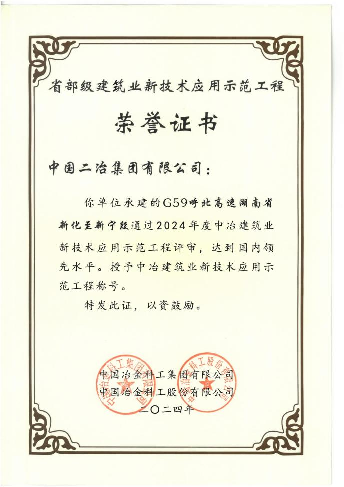 G59呼北高速湖南省新化至新寧段項(xiàng)目在施工過程中注重資源節(jié)約與環(huán)境保護(hù),取得了良好的經(jīng)濟(jì)效益和社會效益。項(xiàng)目成功推廣應(yīng)用了建筑業(yè)10項(xiàng)新技術(shù)中的7大項(xiàng)22個子項(xiàng),包括預(yù)應(yīng)力技術(shù)、高強(qiáng)鋼筋應(yīng)用技術(shù)、高性能鋼材應(yīng)用技術(shù)等,同時創(chuàng)新應(yīng)用了“預(yù)制箱梁腹板水平定位支架”等7項(xiàng)已有技術(shù)成果。此外,項(xiàng)目還開展了“預(yù)制裝配式蓋板涵工藝研究”等4項(xiàng)自主技術(shù)創(chuàng)新,并申請專利9件(其中發(fā)明專利1件),展現(xiàn)了顯著的技術(shù)實(shí)力。
