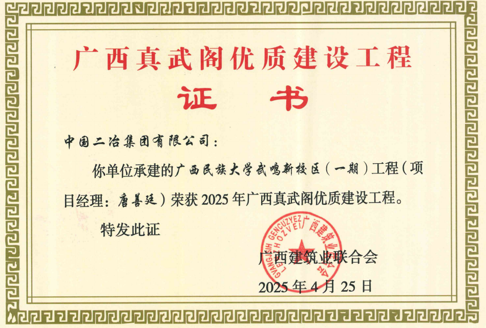 近日,廣西建筑業(yè)聯(lián)合會公布了2025年廣西建設(shè)工程“真武閣杯”獎(最高質(zhì)量獎)工程名單,中國二冶廣西民族大學(xué)武鳴新校區(qū)(一期)工程榮獲此獎項。